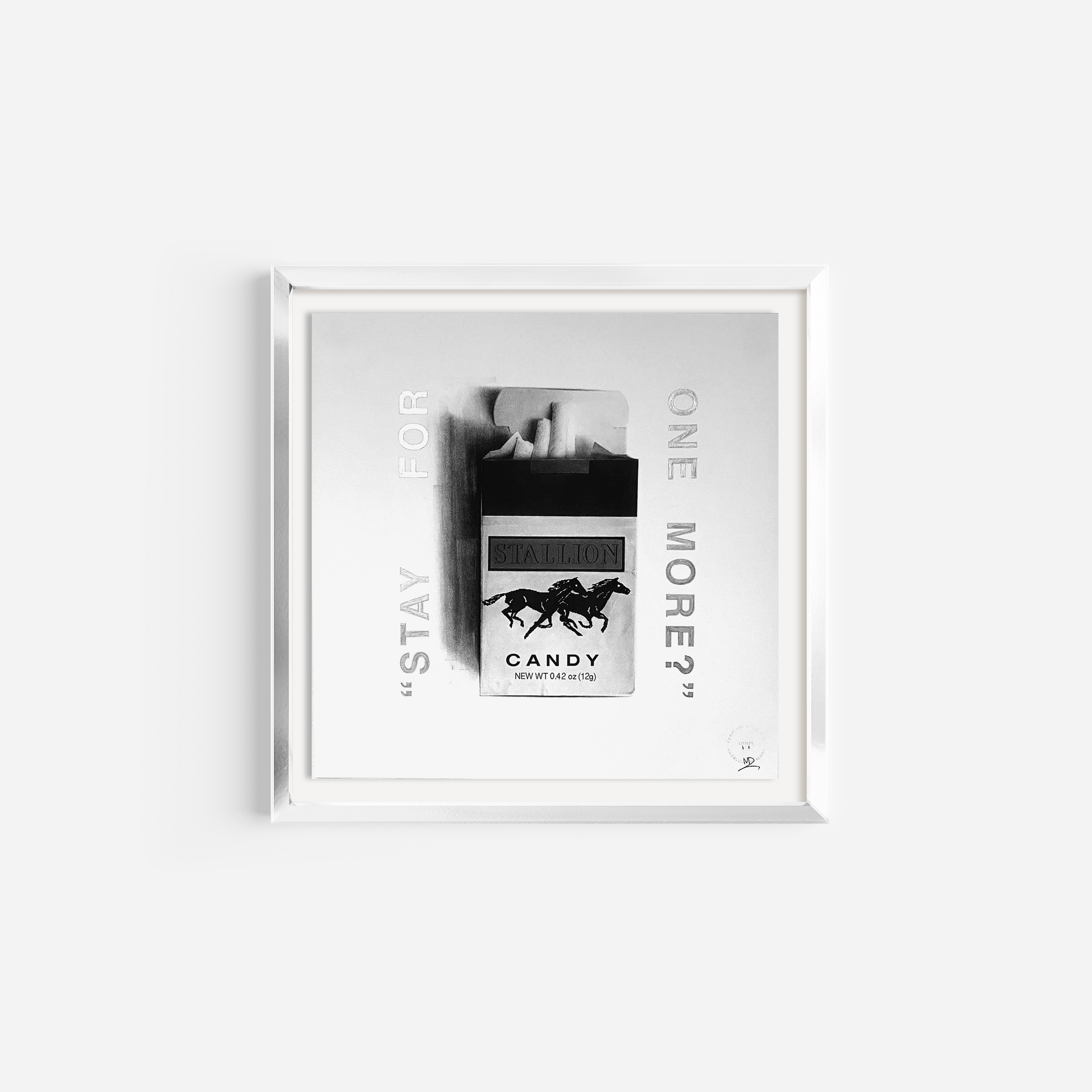 - Giclée printed on archival 190gsm natural Moab Entrada paper (100% cotton & acid-free) in Los Angeles with hand-painted chrome text "STAY FOR ONE MORE?"